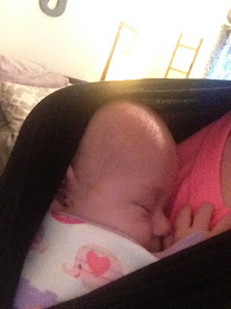 Sleeping:  Getting more consistent, she wakes us when she is hungry and usually goes back to sleep easily.  The trick is to get to her before she gets too fussy.  We still co-sleep some nights and others nights she sleeps well in her bassinet.  We have to swaddle her arms down though, all the "flailing" keeps her awake.  Oh and she makes all kinds of noises at night, I peer into the bassinet thinking she's awake but she isn't so I guess it's part of dreaming.